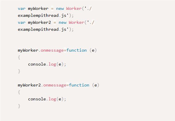 Web Workers can’t be initialized with a function directly. Instead, you need a new file that contains the code you want to run in the thread. For our example, that file (named example7thread.js) has the code shown in the accompanying figure.