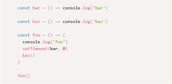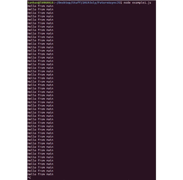 Flavio Copes’ blog has a really interesting code snippet that demonstrates this issue. When you run it, you’ll get the output shown in the accompanying figure—all because the message queue stays blocked until the foo() function releases control of the main thread.