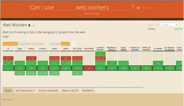 Your operating system already supports preemptive multitasking, so let’s leverage that by spawning threads with Web Workers—a dedicated API with broad browser support. The figure for this step shows the current compatibility status of the feature.