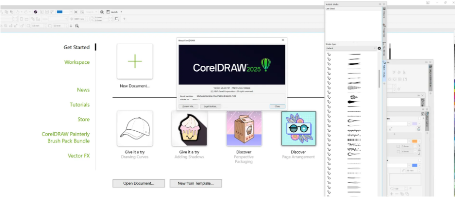 Launching CorelDRAW first brings up a welcome page—similar to what you’d see in Adobe apps or Serif’s Affinity tools. From here, you can open a template, start a blank project, dive into tutorials (including a helpful walkthrough of 2025’s new features for returning users), or visit the in-app store to buy extras: brushes, vector packs, and AI-powered add-ons (like a tool that generates vector art from text prompts).