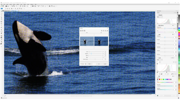 Photo-Paint has some useful features but feels like an afterthought. Highlights include PhotoCocktail (which turns a folder of photos into a mosaic), cropping/perspective correction tools, and basic retouching options (cloning, red-eye removal, spot healing). Adjustments like Levels or Hue/Saturation open in the right sidebar (no floating windows to clutter your workspace). That said, Photo-Paint has clear weaknesses: raw image processing, for example, struggled with our Sony mirrorless camera files—they appeared dark, soft, and had incorrect white balance compared to Adobe Camera Raw. Still, it’s capable enough to prepare raster images for use in CorelDRAW, with sharpening and noise reduction tools to refine photos.