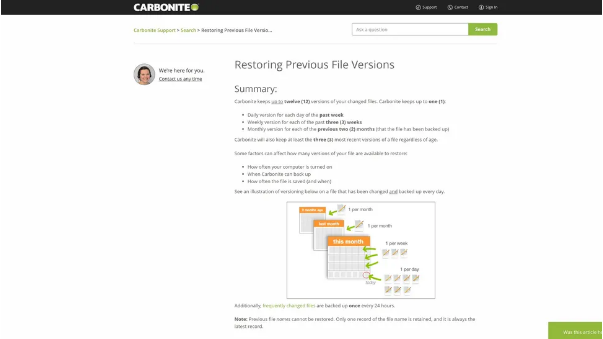 Typically, Carbonite stores up to 12 versions of each file: 1 from each of the past 7 days, 1 from each of the previous 3 weeks, and 1 from each of the prior 2 months. Additionally, you’ll always have access to the most recent 3 versions, no matter how old they are.