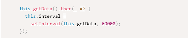 Add the following to componentDidMount in NumberWidgetContainer.js. This will call fetchData now and every minute after. We’ll fix the TypeError in the next step.