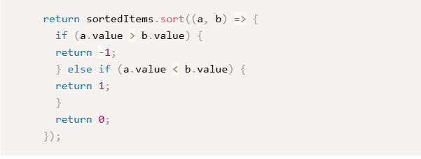 Array sorting functions compare two values. Apply this to sortedItems and return the result to sort content in descending order.