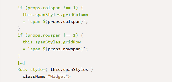To make a widget span columns and rows in CSS Grid, we use the grid-column and grid-row properties. We can pass ‘colspan’ and ‘rowspan’ props to adjust this per component, similar to how table cells work in HTML.