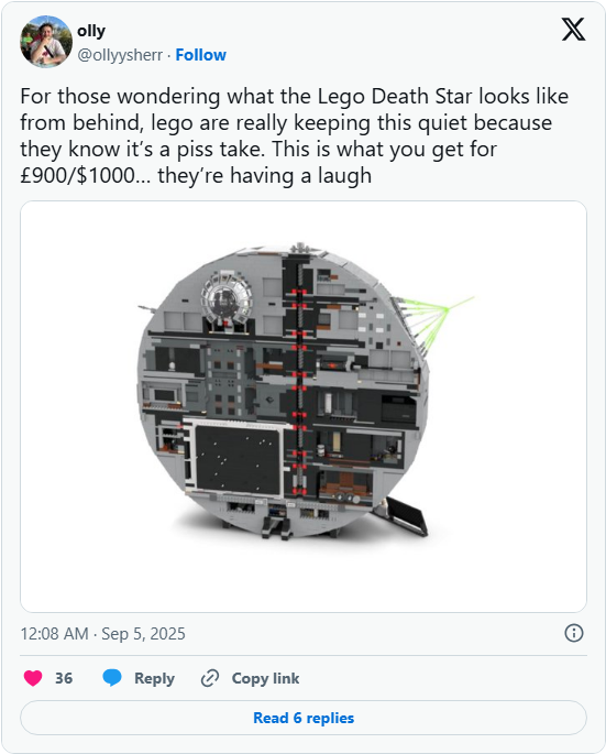 Unsurprisingly, Reddit is blowing up with disappointed Lego fans letting off steam. “$1,000 and it’s just a cross-section?!?” one fan rants. Another adds, “Lego’s making their first-ever $1,000 set… and this is it? Yikes. You’d think they’d at least put out something that could be the ‘crown jewel’ of the Lego brand. Instead, this just feels like a reflection of what the brand’s become— clunky and totally unoriginal.” Someone else sums up the problems perfectly: “Sticker sheets instead of printed pieces, no dual-molded legs, the GWP (gift with purchase) is just a part of the set they stripped out to push impulse buys, it’s not even a hemisphere… and it’s their first $1,000 set.”