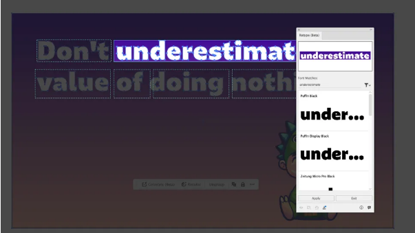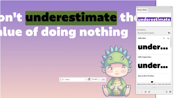 Retype is a smart tool that analyzes static images containing text—even if the text has been converted to outlines (making it uneditable). It scans the letterforms and compares them against the vast libraries of Adobe Fonts and your locally installed fonts. While it may not always find the exact match, it consistently provides a curated list of remarkably similar alternatives, saving you from hours of tedious searching.