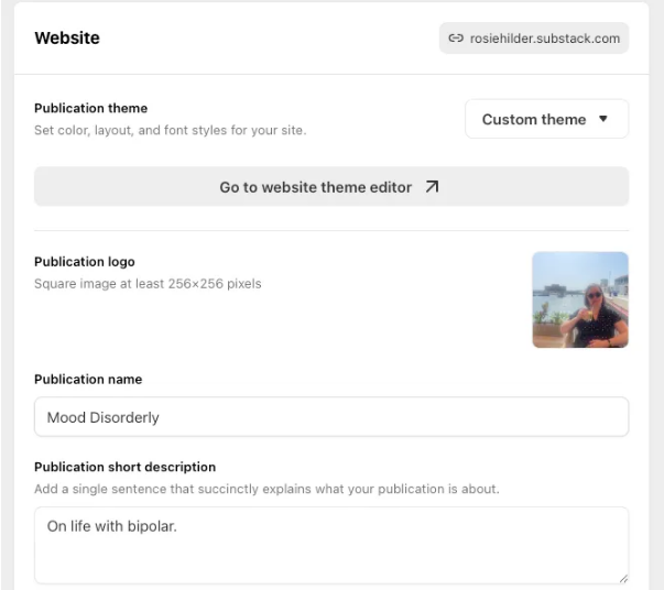 The “Website” tab has a handful of settings you’ll want to adjust—and some are easy to mix up. First, your Publication Logo: This is different from your avatar! Your avatar is the round image that shows up on the right side of your Substack, while your logo is a square image that lives on the left.