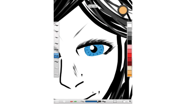 At its core, Sketchbook Ink is a pen-focused drawing app. Its interface keeps things simple: seven brushes and two erasers line the left side of the screen, while a color picker and full swatch palette sit on the right. Along the bottom, you’ll find a brush size slider, undo options, import/export tools, and the familiar “activation ring” from SketchBook Pro—tap it to hide the UI and focus on your work.